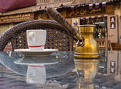 Arabic coffee is made from coffee beans roasted very lightly or heavily from 165 to 210 °C (329 to 410 °F) and cardamom, and is a traditional beverage in Arab culture.[17] Traditionally, it is roasted on the premises (at home or for special occasions), ground, brewed and served in front of guests.[18] It is often served with dates, dried fruit, candied fruit or nuts.[19] Arabic coffee is defined by the method of preparation and flavors, rather than the type of roast beans. Arabic coffee is boiled coffee that is not filtered, made black. Sugar is not typically added, but if so, it can be added during preparation or when serving. It is served in a small delicate cup without handles, called finjān. Sometimes, the coffee is moved to a larger and more beautiful pour pitcher to serve in front of the guests, called Dallah. Often, though, the host prepares coffee in the kitchen and highlights a tray of small cups of coffee.[20] Arabic coffee is distinct from American coffee in a number of ways. Arabic coffee is produced using Arabica beans that have been gently roasted and delicately powdered. Cloves, cardamom, and saffron are typical flavours that do not contain sugar or milk. Darker-roasted American coffee is served in quantity with sugar and milk, but no spices.[21] Unlike Turkish coffee, traditional Arabic coffee, with its roots in Bedouin tradition, is usually unsweetened (qahwah saada). To make up for the bitter flavor, coffee is usually served with something sweet – dates are a traditional accompaniment – and other desserts are often served along with a tray of coffee cups.[19]