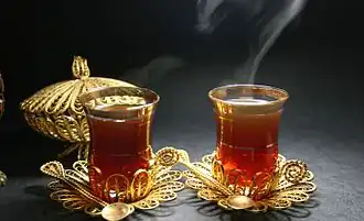 Arabic tea (Arabic: شاي عربي, romanized: šāy ʿarabiyy, pronounced shay [ʃæiː] ⓘ), is a variety of hot teas popular throughout the Arab world. It is commonly served to guests and business partners at meetings and social events, and has been drunk by Arab people for centuries.[1][2]