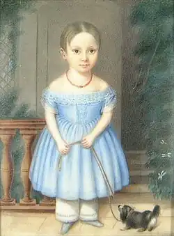 Two portraits by Vail, both of children, are currently in the collection of the Metropolitan Museum of Art.[1][2] A pair of portraits, once thought to be of the artist and her son, belong to the Cincinnati Art Museum.[4] "Portrait of a Woman" dates to approximately 1840, and includes typical black garments of the time with a delicate lace collar, pinned by a brooch with its own miniature painting.[5] "Portrait of a Young Man" dates to the same time frame.[6] Another portrait, dated to 1840, is owned by the Yale University Art Gallery.[7] Few of Vail's works have been published; her style has been described as "idiosyncratic" and her figures "unusually constructed", and she favored a matte finish on her pieces, unlike other painters of her generation.[4]