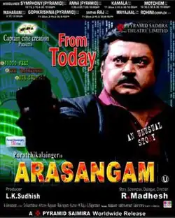 Arasangam (transl. Government) is a 2008 Indian Tamil language political thriller film written and directed by R. Madhesh and produced by L. K. Sudhish. The film stars Vijayakanth in the lead role, making this his 150th film, along with Biju Menon in a dual role, while Navneet Kaur, Sheryl Pinto, Rahul Dev and Riyaz Khan play supporting roles. The film's soundtrack was composed by Srikanth Deva with cinematography by Venkatesh Anguraj and editing by Anthony. The film was released on 9 April 2008.