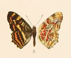 A. prorsoides Blanch. (64f) resembles fallax [Araschnia fallax Janson, 1877 is a summer form of Araschnia burejana) on the upperside, but is recognizable by the different position of the outer costal spots of the forewing, the markings in the distal area, and the 3 almost parallel stripes resp.bands of the hindwing. In ab. levanoides Blanch. (64d) all the markings are reddish brown and partly more prominent but narrower; corresponds nearly to strigosa. West China, ? Japan (Oiwake); also in North India:Naga Hills. In ab. flavida Oberth. the pale markings are very much extended; the forewing bears in and below the cell large yellowish patches, the posterior spot of the costal halfband is prolonged into a streak;the hindwing brownish and whitish from the base to the submarginal band, only the basal area bearing still some dark spots; the distal margin dark brown, the inner edge of this band arcuate and near the same a row of dark spots on the light-coloured portion of the wing. The underside is whitish for the greater part, both wings bearing some dark-edged brownish spots in the basal area and indistinct yellowish and blackish shadows and stripes in the middle and outer areas. From Siaolu.[2]