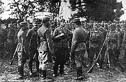 During this time, Wilhelm's forces developed close ties with local fighters, including the Skhidniaky ("Easterners"), especially the Zaporizhzhia Corps of the Ukrainian Army.[1] Although these actions drew criticism from German and Austrian officials in Kyiv, they increased Wilhelm's popularity among Ukrainians, who affectionately referred to him as Kniaz Vasyl (Prince Vasyl).