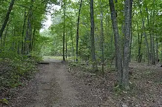 Site 44-AU-154 lies on the southern side of Paine Run at the mouth of its hollow, on the edge of the national park and at the foot of the Blue Ridge, thus occupying a transition zone between the Shenandoah Valley and the mountain. It extends from the stream to the base of the mountain, approximately 25 metres (82 ft) north to south, while east to west it is four times as long.[3]: 66 At the time of its discovery, a Forest Service fire road bisected the site; the northern half was partially occupied by a privately owned house, while the southern half was part of the national park.[3]: 67 Approximately 400 metres (1,300 ft) east of the site is a rock outcrop with several rockshelters, including the significant Paine Run Rockshelter.[3]: 71