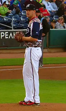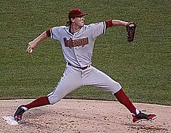 After attending spring training with the Diamondbacks, Bradley was assigned to the Triple-A Reno Aces at the beginning of the 2014 season.[19] His agent pushed for Bradley to be called up to the majors, arguing that Bradley was only being kept in the minor leagues to allow the Diamondbacks to retain his original contract for a longer period of time. Diamondbacks general manager Kevin Towers said that promoting Bradley would put unnecessary pressure on the pitcher, as the team had the worst ERA in MLB, and Towers told Fox Sports that, "I know how it would be perceived if he came up: 'Archie is going to save us.'"[20] Bradley missed nearly two months of the 2014 season after sustaining an elbow injury in late April. He began making rehab assignments at the end of June, with a 75-pitch limit.[21] In only 18 season appearances and 83 innings, Bradley posted a 3–7 record, a 4.45 ERA, and 75 strikeouts in 2014.[13]