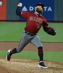 During the 2020 offseason, Bradley underwent contract arbitration, arguing for a $4.1 million salary rather than the $3.625 million that the Diamondbacks had offered him.[41] The arbitration committee ruled in favor of Bradley on February 21, making him the first largely non-closing reliever to make more than $4 million with fewer than 30 career saves.[42] On July 18, after a delay in the MLB season due to the COVID-19 pandemic, Bradley was named the Diamondbacks' closer for the 2020 season.[43] He made only 16 appearances for the club that season, going 2–0 with a 2.95 ERA.[27]