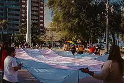 In addition to its mission to preserve and share materials that recover the Argentine trans memory, the AMT has also been deeply engaged in activism, leading numerous initiatives and legal actions in the ongoing struggle for the rights of the trans community.[13] Since 2017, on the International Transgender Day of Remembrance, celebrated on November 20th, the AMT has organized a demonstration called "the Candle Action", in which participants carry candles and photographs of trans individuals who have died or been murdered, and collectively honor their memory.[13] Beginning in 2020, the AMT has also organized the Banderazo (from the Spanish word bandera, meaning "flag"), a nationwide action involving the journey of a large trans flag across various provinces of Argentina.[13][34] At each stop, the names of deceased trans and travesti individuals are inscribed on the flag as a collective act of remembrance.[13][34] A political action aimed at visibility and the pursuit of rights, the initiative culminates on the International Trans Day of Remembrance at the former ESMA clandestine detention center, and is framed within broader demands for a comprehensive trans law and historical reparation.[13][34]