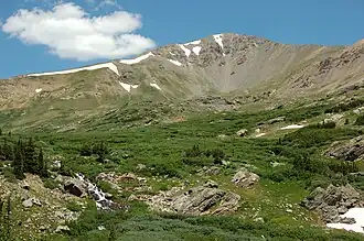Argentine Peak is a high mountain summit in the Front Range of the Rocky Mountains of North America. The 13,743-foot (4,189 m) thirteener is located in Arapaho National Forest, 8.5 miles (13.6 km) southwest by south (bearing 211°) of Georgetown, Colorado, United States. The summit lies on the Continental Divide between Clear Creek and Summit counties.[1][2][3][4][5]