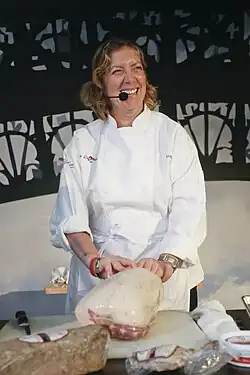 Ariane Daguin is a French-American business owner, author, culinary celebrity and educator. Born in Auch, in the Gascony region of France, she was the first child[1] of parents Jocelyne and Michelin-starred chef André Daguin.[2] She is the co-founder of the American gourmet meat distributor, D'Artagnan[1] where she served as CEO until 2022. She remains active as a consultant. She also co-founded the non-profit farm foundation All For One One For All (AOOA) Farm in 2021,[3] which includes a distillery and café open to the public.[4] In addition to her culinary and business ventures, she is also a philanthropist and investor in several food startups.