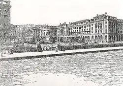 Before the Great Fire of 1917, the city lacked much of what was considered to be 'essential' in European architecture.[3] Until 1912, Thessaloniki had been part of Ottoman Turkey for almost 500 years. Under Ottoman rule, the city grew without the guidance of a general plan for expansion and had narrow streets.[4] The absence of squares in pre-1917 Thessaloniki was addressed by Ernest Hébrard, who proposed a number of large squares in the city, including Megalou Alexandrou Square ("Alexander the Great Square"), now Aristotelous Square.[3][4]