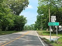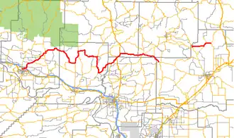 The route begins at U.S. Route 64 (US 64) in Russellville and runs north to Interstate 40 (I-40). It continues east to intersect Highway 164 in Moreland and Highway 105 in Caglesville before entering Conway County.[2] AR 124 winds east and then south in Conway County before forming a concurrency with Highway 95.[4] The highway runs east to concur with Highway 9 in Center Ridge, becoming Highway 92/Highway 124 until Springfield. Highway 124 briefly enters Faulkner County, where it intersects and concurs with US 65 for 2.2 miles (3.5 km).[5][6] Highway 124 enters Cleburne County and has many intersections in Quitman, including Highway 25.[7] The highway continues east into White County to Highway 36 in Rose Bud, where it terminates.[3] This route is entirely two-lane,[1] and has an officially designated exception of 0.66 miles (1.06 km) over Highway 25 in Cleburne County.[8]