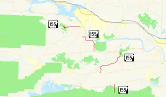 Arkansas Highway 155 (AR 155 and Hwy. 155) is a designation for four state highways in Arkansas. The northernmost segment of 7.10 miles (11.43 km) runs from Mount Nebo State Park to AR 22 in Dardanelle.[1] A second segment in Yell County of 7.56 miles (12.17 km) connects Highway 7 and Highway 154.[2] A third segment runs 11.16 miles (17.96 km) from AR 10 near Casa to Petit Jean State Park.[3] The fourth segment is a 2.68-mile (4.31 km) spur from Highway 60 south to an area near Deberrie.[4]