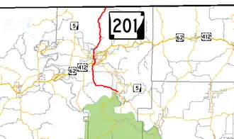 Highway 201 (AR 201, Ark. 201, and Hwy. 201) is a north–south state highway in Baxter County, Arkansas. The route runs 24.05 miles (38.70 km) from Arkansas Highway 341 in Salesville north to the Missouri state line through Mountain Home, the county seat of Baxter County.[3]