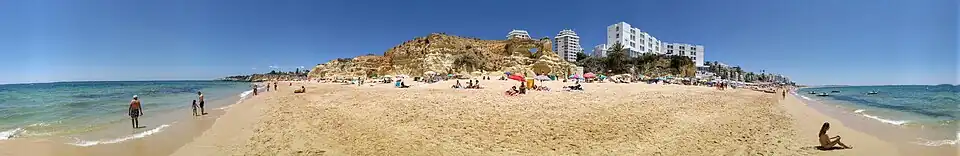 The town (vila in Portuguese) of Armação de Pêra is a popular tourist center with fine beaches, hotels, cafés and restaurants.[5] It is on a broad bay that stretches from Pont da Galé to Senhora da Rocha. Its beaches[6] extend from Praia dos Pescadores[6] or the Fishermen's Beach, to Salomão beach,[6] including those of Maré Grande[6] and Beijinhos.[5]
