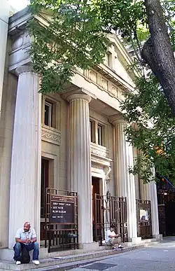 The building that the church occupies on East 34th Street was originally constructed in 1907 as a branch for the 19th Ward Bank.[2][5][7] Designed by architect William Ralph Emerson, the limestone structure includes Doric columns and was similar to the plans for another branch of the bank located on the Upper East Side, although the land lot for the branch on 72nd Street was only 20 feet (6.1 m) wide, as compared to a width of 36 feet (11 m) for the site on 34th Street.[8] The architectural style was chosen so that the bank building would stand out among the row of brownstones that stood on either side of the site.[8][9] As of 2015, the former 19th Ward Bank branch location at 180 East 72nd Street was occupied by the Provident Loan Society.[10]