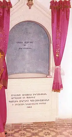 Վերանորոգեցաւ մատուռս սրտաբուխ ծախիւք Տէր եւ Տիկին Յովհաննէս Շաքարեանի ի յիշատակ ննջեցելոց իւրեանց 1947 (This chapel was restored by the generous expenses of Mr and Mrs Hovhannes Shakarian in memory of their deceased 1947)