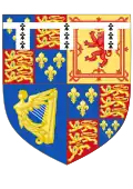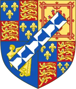 Quarterly: I and IV, grandquarterly azure three fleurs de lys or (France modern) and gules three lions passant guardant or (England); II, or, a lion gules, double tressure flory and counter-flory of the same (Scotland); III, a harp or, stringed argent (Ireland); a baton sinister couped gules, charged with three roses argent, seeded and barbed vert, brochant sur-le-tout. |