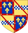 Quarterly, I and IV grandquarterly: 1 and 4 azure three fleurs de lys or and 2 and 3 gules three lions passant guardant or; II or, a lion gules, double tressure flory and counter-flory of the same and III azure, a harp or, stringed argent; overall a label argent. |