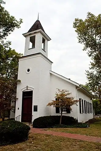The church was erected in the summer of 1831 under the leadership of Samuel Earhart;[4] its walls, built of brick,[5] were constructed from locally made bricks whose clay originated on Earhart's property.[4] The adjacent cemetery had already been founded; its first burial was Hannah Armstrong, who had died four years before the church's completion in the fall of 1831.[3] Nathanial Armstrong provided that the church be made available for the use of whichever denomination had the greatest number of members in the vicinity. Both at that time and at all times since, the church has been used by Methodists.[2] Relatively few changes have been made to the building since its construction; a tower was added in 1890, but only minor repairs have been carried out otherwise. Although the foundation was built of fieldstones and held together by soil rather than mortar, it has moved only slightly; a restoration performed in the 1970s demonstrated that the building had settled just 2 inches (51 mm) in 140 years.[6]