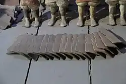 Han armour was similar to the armour used by the Qin dynasty with some variations and improvements. Soldiers wore suits of lacquered rawhide, hardened leather, bronze, iron, or steel, and came in varieties such as scale and lamellar. Helmets came as rawhide or hardened leather caps that were sometimes supplemented by a layer of metal lamellar, or made of metals such as iron or steel. Some riders wore armour and carried shields and some horses were at least partially armored, but substantial cataphract-like armor with comprehensive armor covering the entire horse is not attested to in writing until the late 2nd century.[31]