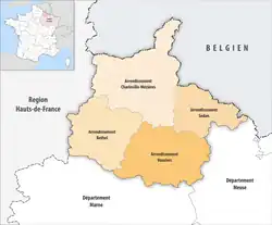 - Arrondissement of Vouziers, (subprefecture: Vouziers) with 118 communes. The population of the arrondissement was 21,052 in 2021.