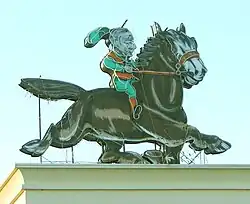 The advertising sign for Arthur Barnett is a prominent feature on the Dunedin skyline. Named Can't Stop, this neon sign features a small man (representing the firm's founder) trying to control a large horse, possibly a Clydesdale.