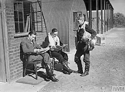 Blake, at centre, relaxes with other pilots at Fowlmere, September 1940