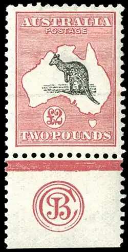 The record-breaking 1913 £2 kangaroo and map stamp with lower sheet selvedge with JBC monogram. Formerly in the Arthur Gray collection.