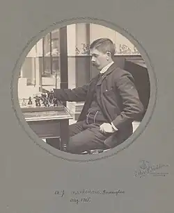 Although born in Birmingham, Arthur John Mackenzie was associated with chess in Scotland because of his family background. He participated in Scottish Chess Championship from 1906 to 1928 and won this chess tournament on three occasions: 1908 (he scored 7/7),[1] 1909[2] and 1913.[3] He was Warwickshire County Chess Champion in 1931. Arthur John Mackenzie was multiple participant of the Hastings International Chess Congress minor tournaments.