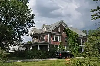 The Perkins House stands near the southern Rutland city limit, at the southeast corner of Curtis and South Main Streets (the latter designated United States Route 4). The area is now a mixed commercial and residential area. The house is a 2+1⁄2-story masonry structure, set near the front of a large landscaped lot that extends east to Chase Avenue. It has a gabled roof, the gable eaves extended and adorned with carved brackets, and the front roof facade pierced by a gabled dormer on the right, and a slightly projecting gable section on the left. The left section shelters a polygonal window bay on the second floor. A single-story hip-roof porch extends across the front, fashioned largely out of concrete, including precast Tuscan columns mounted on pedestals, with precast concrete balustrades between. The interior of the house retains original woodwork and other decorative features.[2]