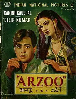 Arzoo (lit. 'Desire') is a 1950 Indian Hindi-language romantic drama film directed by Shaheed Latif and produced by Hiten Chaudhary. The film stars Dilip Kumar, Kamini Kaushal and Shashikala. The film's music is by Anil Biswas. Cuckoo appears as a dancer in the song "Aao Milke Jawani Ki Loote Bahaar". It is loosely based on Emily Brontë's 1847 novel Wuthering Heights.[1][2]