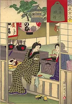 The development of Asakusa as an entertainment district during the Edo period came about in part because of the neighboring district, Kuramae. Kuramae was a district of storehouses for rice, which was then used as payment for servants of the feudal government. The keepers (fudasashi) of these storage houses initially stored the rice for a small fee, but over the years began exchanging the rice for money or selling it to local shopkeepers at a margin.[1] Through such trading, many fudasashi came to have a considerable amount of disposable income and as result theaters and geisha houses began to spring up in nearby Asakusa.