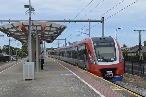 Ascot Park was opened on 6 April 1914.[2][3] When the Hallett Cove line was duplicated in 1955, the single platform was converted to an island platform.[4] As part of a grade separation project to eliminate the Daws Road and Marion Road level crossings, the station was demolished and rebuilt, reopening in March 1974.[5][6][7] The station shelters were replaced in 2014 when the line was electrified and extended to Seaford.