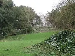 In its earliest form, the castle was an earth and timber ringwork fortification. The ringwork was located on a spur of high ground and consisted of a banked rampart surrounded by a deep ditch, probably re-using the earlier Iron Age defences. A Great Hall and/or tower stood within the ringwork. Extending westwards in a loop from the ringwork was a second, outer bank enclosing a broadly rectangular court - the bailey - which contained all the ancillary domestic buildings associated with such a settlement. Both banks were surmounted by wooden palisades.[9] Also located in the bailey was the parish church, St Mary's Church, Ashley, which probably dates from the same period as the original castle (early 12th century). The church survives, long outliving the castle. The visible remains of the castle now consist of sections of the ditch and ramparts.