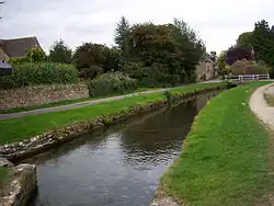 The river forms two channels – making a large square – in the parish, enclosing the western half of the village and in the past powering mills of a modest nature.[32] The south-western channel is joined by the Swill Brook and smaller tributaries join, particularly at the re-convergence of the channels. The Thames' north-eastern channel, the village channel, is deeply entrenched at the places it has frontage to more than 30 of the village's homes and where it is crossed by many flat-deck bridges, some of brick or stone arch. One public bridge, Gumstool Bridge, is not quite flat.[33] Made of limestone it is "probably medieval"; it has two arches, vertical sides rising to form a parapet 80 cm high, triangular copings and a raised, squared apex.[33] Two other bridges are consistent with a slightly pre-1800 date.[34] The manor house and adjacent church farm enjoy the vestige of a moat, its southern limb; the rest was intact for many centuries, as seen in maps of the 19th century.