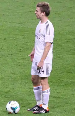 Illarramendi scored his first league goal for the Merengues on 22 February 2014, after his long-range effort against Elche was deflected and the hosts won 3–0.[13] His second came on 5 April, when he opened an eventual 4–0 victory at his former team Real Sociedad in the 44th minute.[14] He was a regular in the domestic cup campaign, coming on as a late substitute for Ángel Di María in the 2–1 final defeat of FC Barcelona,[15] adding 11 matches – five starts – in the team's Champions League run but remaining on the bench as they clinched the trophy against Atlético Madrid in the final at the Estádio da Luz.[16][17]