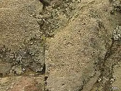 Aspicilia pacifica (pacific sunken disk lichen) is a white to grayish, brownish, or ocher crustose areolate lichen that commonly grows on siliceous rock or basalt along the seashore and in higher coastal mountains of California and Baja California.[1]: 2** [2] It has numerous small (0.1–.8 mm), round to angular apothecia toward the middle of the thallus, with concave to flat black discs that are sometimes lightened with white pruina.[2] Lichen spot test on the cortex and medulla are I−, K+ yellow to red, P+ orange, and C−.[2] Secondary metabolites include much stictic acid, and some norstictic acid.[2]