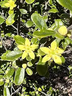 Asterolasia buxifolia is a spindly shrub that typically grows to a height of 1–2 m (3 ft 3 in – 6 ft 7 in) with its stems covered with star-shaped hairs. The leaves are leathery and egg-shaped with the narrower end towards the base, 5–18 mm (0.20–0.71 in) long and 3–10 mm (0.12–0.39 in) wide on a petiole 2–7 mm (0.079–0.276 in) long. The upper surface of the leaves is glabrous but the lower surface is covered with star-shaped hairs. The flowers are arranged singly in leaf axils, each flower on a pedicel up to 1–1.5 mm (0.039–0.059 in) long. The five petals are yellow, elliptical, 6–7 mm (0.24–0.28 in) long and covered with star-shaped hairs on the back.[3][4][5]