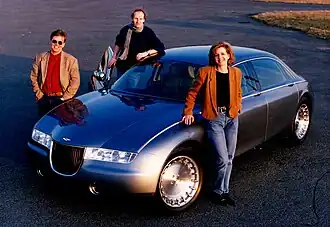 The 3 designers of the 1993 Lagonda Vignale with the car (l-r): Moray Callum, David Wilkie, Sally Erickson Wilson.