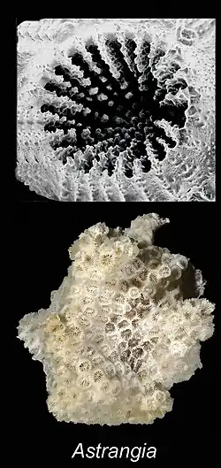 Astrangia is a genus of stony corals in the family Rhizangiidae. Members of this genus are non-reef building corals and are found in the Atlantic and Indo-Pacific Oceans. They are solitary corals with large polyps and are found in clumps. They reproduce from stolons. The corallites are small with simple toothed septa.[1]