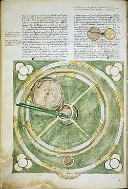 Dondi documented the Astrarium in detail in the Tractatus astrarii, which is the earliest complete surviving description of its kind; the St Albans abbey clock designed by Richard of Wallingford predates it, but survives only as fragments (reconstructed by John North).[1]: 8 [2]: 2:364–5  In the introduction, Dondi writes that his machine was built in accordance with the 13th-century Theorica planetarum of Campano di Novara, and to demonstrate the validity of the descriptions of the motion of heavenly bodies of Aristotle and Avicenna. The Tractatus survives in twelve manuscript sources. The autograph in the Biblioteca Capitolare of Padova (MS. D39) and a copy of it, also in Padova, are certainly the work of Dondi. The other sources are rewritten versions of the autograph, to which Dondi's contribution is as yet unclear.[3] The autograph manuscript was published in 1987 in a critical edition with colour facsimile and French translation by Poulle as the first volume of the Opera omnia of Jacopo and Giovanni Dondi.[4]