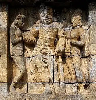 The guarding figure asura giant dvarapala holding mace flanked by two apsaras. The bas-relief of lower outer wall of Borobudur separating Kamadhatu and Rupadhatu realm. 8th century Central Java, Indonesia.