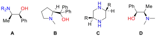 Various chiral ligands have been studied for use in this reaction. The acidity of the terminal alkynyl proton allows the alkynylzinc compound to be generated in situ from the appropriate alkyne with an alkylzinc reagent or zinc triflate, Zn(OTf)2.[1] The first example of catalytic asymmetric addition of alkynylzinc compounds to aldehydes was reported by Kensō Soai and co-workers in 1990. In their experiments, chiral amino alcohols (A and B in the figure) and amines (such as C) were used as ligands, and the alkynylzinc reagent was prepared from reaction of alkyne with diethylzinc. Yields were high but the resulting enantiomeric excesses were poor, the greatest achieved being only 34% with 5 mol% ligand loading.[8] Carreira and co-workers achieved significantly higher enantiomeric excesses (up to 99%) using stoichiometric amounts of the (1S, 2R)-enantiomer of N-methylephedrine (D) at room temperature with a broad range of aldehydes, and generating the alkynylzinc compound using Zn(OTf)2.[9]
