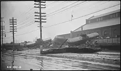The Ohio River flooded in late January 1937 after heavy rain earlier in the month, causing damage along the river and smaller tributaries. Temperatures were cold enough that ice was reported floating along northern portions of the river. Five states were impacted: West Virginia, Ohio, Indiana, Illinois, and Kentucky, with a total of one million left homeless by the flooding.[7] The flood destroyed more than half of the city of Louisville, Kentucky, putting seventy percent of the city under water and forcing 175,000 residents out of their homes. The West End and downtown were submerged under 10 feet (3.05 m) of water. The river crested at approximately 52.15 feet (15.89 m) on January 27, and the water was still receding in February.[8] Flood damage was estimated at $250 million ($5.47 billion in 2024). According to the American Red Cross, it was the greatest natural disaster in the organization's history up to that point. The National Association for the Advancement of Colored People (NAACP) contacted the United States Coast Guard for help, with reports that Black residents were facing discrimination when it came to flood rescues.[9]