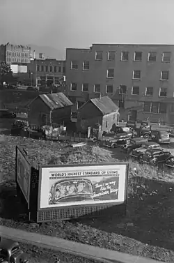 At the Time of the Louisville Flood, also popularly known as World's Highest Standard of Living, is a black and white photograph taken between January and February 1937 by photojournalist Margaret Bourke-White. Bourke-White was on assignment for Life magazine covering the aftermath of the Ohio River flood, which left seventy percent of the city of Louisville underwater. The photo shows Black flood refugees waiting in line for Red Cross relief with a billboard advertisement for the National Association of Manufacturers in the background that reads "World's Highest Standard of Living: There's No Way Like the American Way".[1]