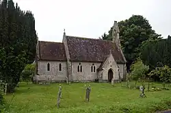 Across the former A35 road is the former Church of England parish church of St John, built in 1861–62 to move the old parish church away from the house. St John's was designed by the Dorchester architect John Hicks,[21] who employed Thomas Hardy at the time. The Diocese of Salisbury declared St John's redundant in 1975, after which it fell into disrepair. The church, its pews and most of the graveyard were purchased by Athelhampton Estate in order to protect the building.[22] It is now used by the Antiochian Orthodox parish of St Edward King and Martyr. A congregation worships at services at the church every Sunday.