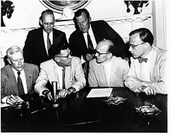![]() Spilhaus is standing to the right during the announcement of plans for the building and launching of the world's first human-made satellite, July 29, 1955. (NASA) | |
