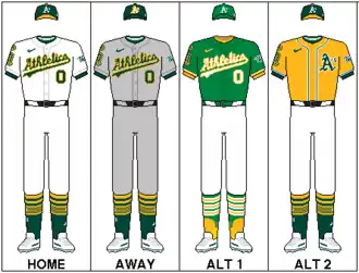 The 2023 team wore home uniforms with "Athletics" spelled out in script writing and road uniforms with "Oakland" spelled out in script writing, with the cap logo consisting of the traditional "A" with "apostrophe-s". The home cap, which was also the team's road cap until 1992, is forest green with a gold bill and white lettering. This design was also the basis of their batting helmet, which is used both at home and on the road. The road cap, which initially debuted in 1993, is all-forest green. The first version had the white "A's" wordmark before it was changed to gold the following season. An all-forest green batting helmet was paired with this cap until 2008. In 2014, the "A's" wordmark returned to white but added gold trim.