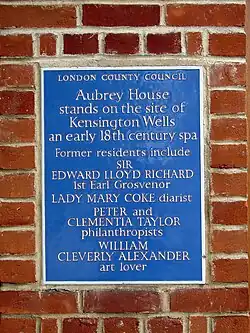 A London County Council blue plaque was unveiled in 1960 to commemorate the notable residents of Aubrey House. Sir Edward Lloyd, Lady Mary Coke, Peter and Clementia Taylor and William Cleverly Alexander are listed on the plaque.[14]