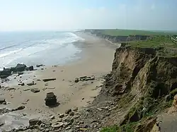 A key industry in the village is tourism and there is a caravan park located on former agricultural land near the beach. The cliffs are made of soft marl clay and are subject to erosion. Numerous properties have been demolished over the years to prevent them from falling into the sea.[11] The position of a road leading down to the beach (long since lost to the sea) is clearly visible. The road still exists to the clifftop, which is blocked off by a barrier, and the rocks that supported the slope are still visible at low tide, giving an indication of how far the cliff has eroded. The coast road was completely lost to the sea by 1996.[12] Barmston is one of the worst locations in England for coastal erosion; in 1967, 20 feet (6 m) of coastline was lost over just two days due to storms in October.[13] The rate of erosion varies from year to year and is down to the tides and which way the winds are blowing, but typically the amount is between 4 feet (1.2 m) and 8 feet 2 inches (2.5 m) per year.[14][15]