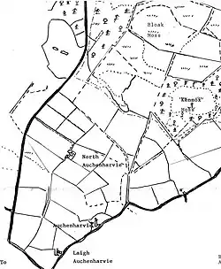 | The meaning of Auchenharvie is suggested by Timothy Pont in 1604 - 08[2] as being 'the hill or 'knoppe' in the field of yellow corn'. |